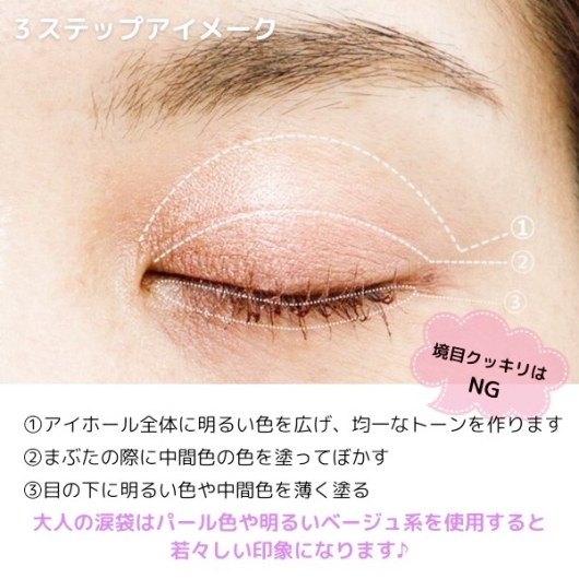 ・カラー: 年齢によりまぶたのくすみが気になる場合、明るめのベースカラーを取り入れるといいです🙂