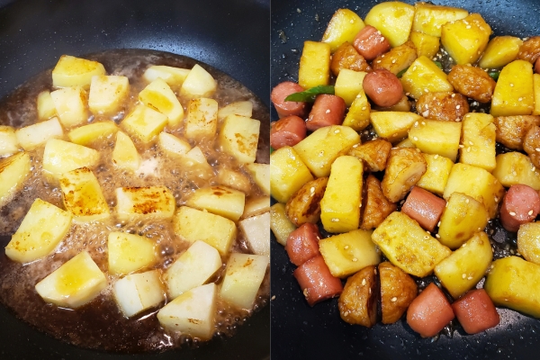 ソーセージは油なしでジャガイモは油をひいて色がつくまで焼きます。